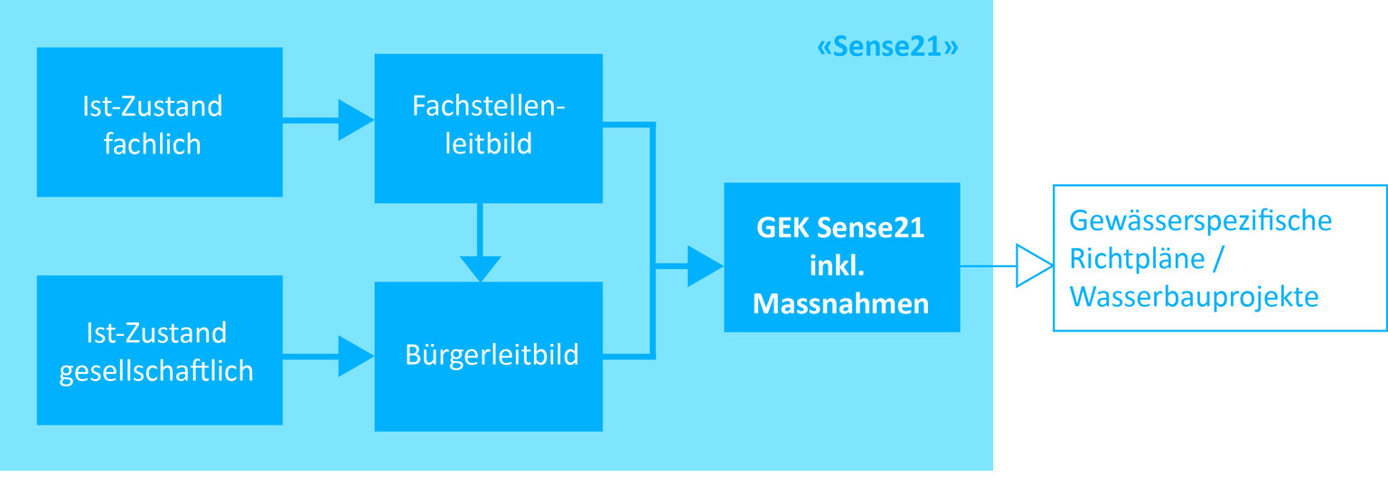 Das GEK Sense21 wurde in drei Phasen erarbeitet: In der ersten Phase wurde der heutige Zustand aus ökologischer, wasserbaulicher, wirtschaftlicher und gesellschaftlicher Sicht beschrieben (Ist-Zustand). In der zweiten Phase wurden die Ziele aus fachlicher und gesellschaftlicher Sicht formuliert und in einem Fachstellen- und einem Bürgerleitbild festgehalten.